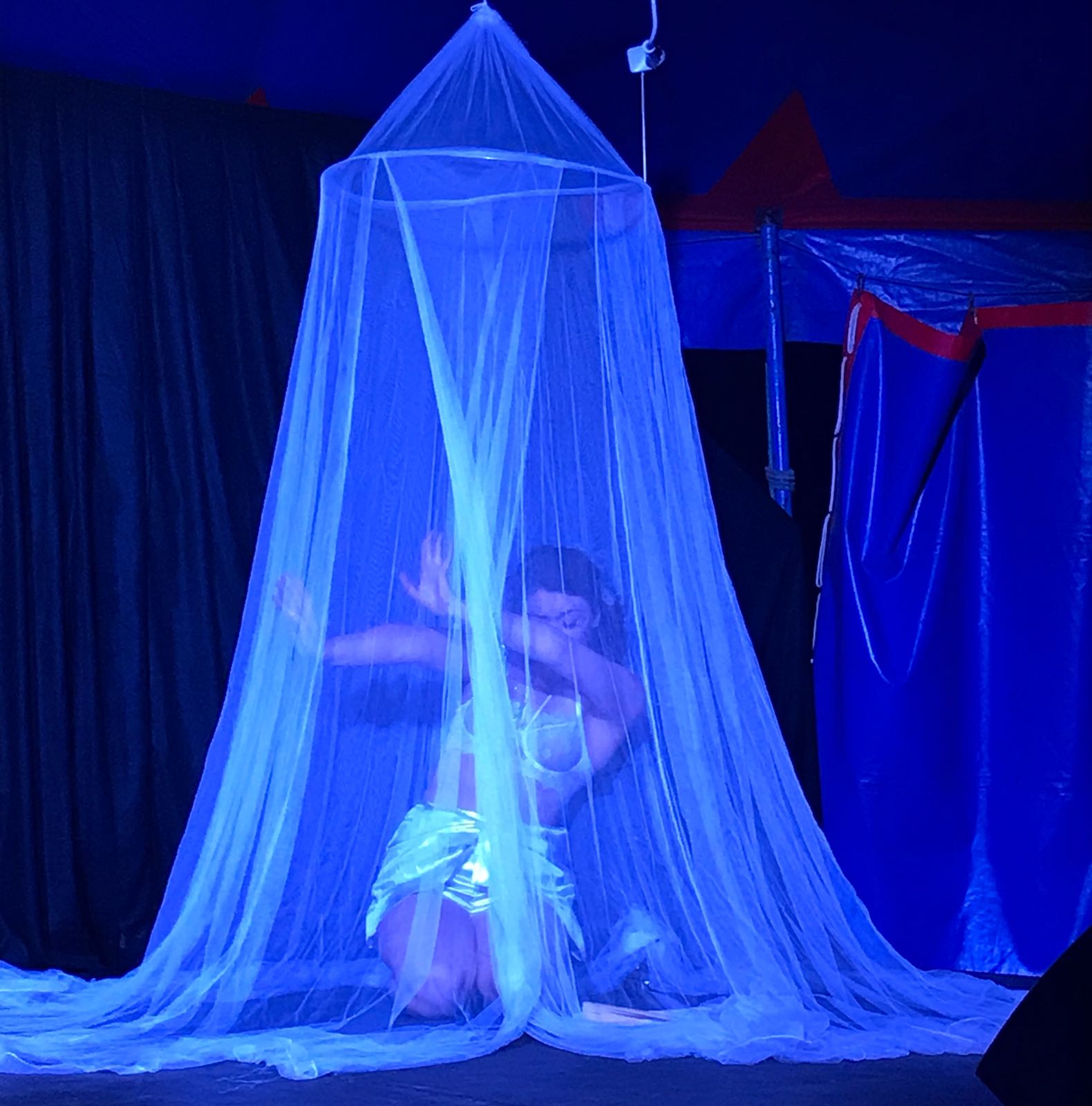 BELLE: Well, yeah, actually, maybe that is a better way to describe it, though, because people will actually know what that is, rather than a bed canopy, which sounds kind of massive and medieval, yeah (laughter). So that kind of represented the bell jar, and my piece was about kind of breaking out and never knowing when it might fall on you. Which actually did happen in one of the shows.